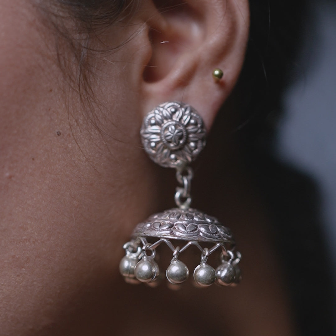 A pahadi-inspired geometric floral motif jhumki made in 92.5 pure silver. Reinterpreting the classic dome jhumkis with iconic pahadi motifs, moulds dated over 200 years old, handcrafted using indigenous techniques. Each piece is beautifully and passionately made, are lightweight and effortless to style with festive, occasional and street wear. Available in different finishes, please check before making your purchase. Our products are handcrafted, slight irregularities are natural and only make it unique.