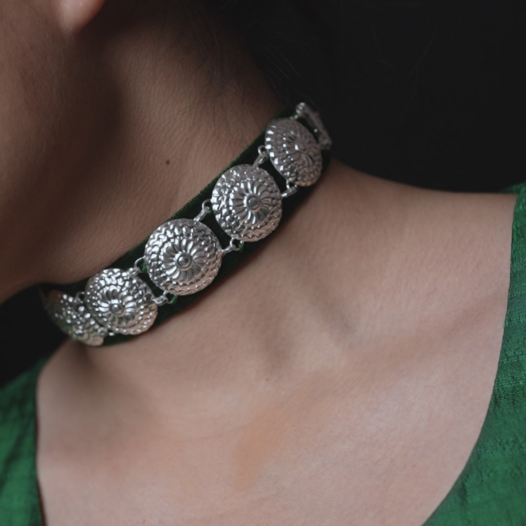 This is a chakra floral inspired traditional pahadi-style choker in 92.5 pure silver, tugged onto a handwoven thread belt to fasten. The moulds are over 200 years old, and each piece is handcrafted with indigenous techniques, are lightweight and one-size fits all. Our jewels can be effortlessly styled with festive, occasional and street wear redefining new-age staples. This Guluband pairs well with matching earrings and can be layered with our matarmalas to create unique styles.