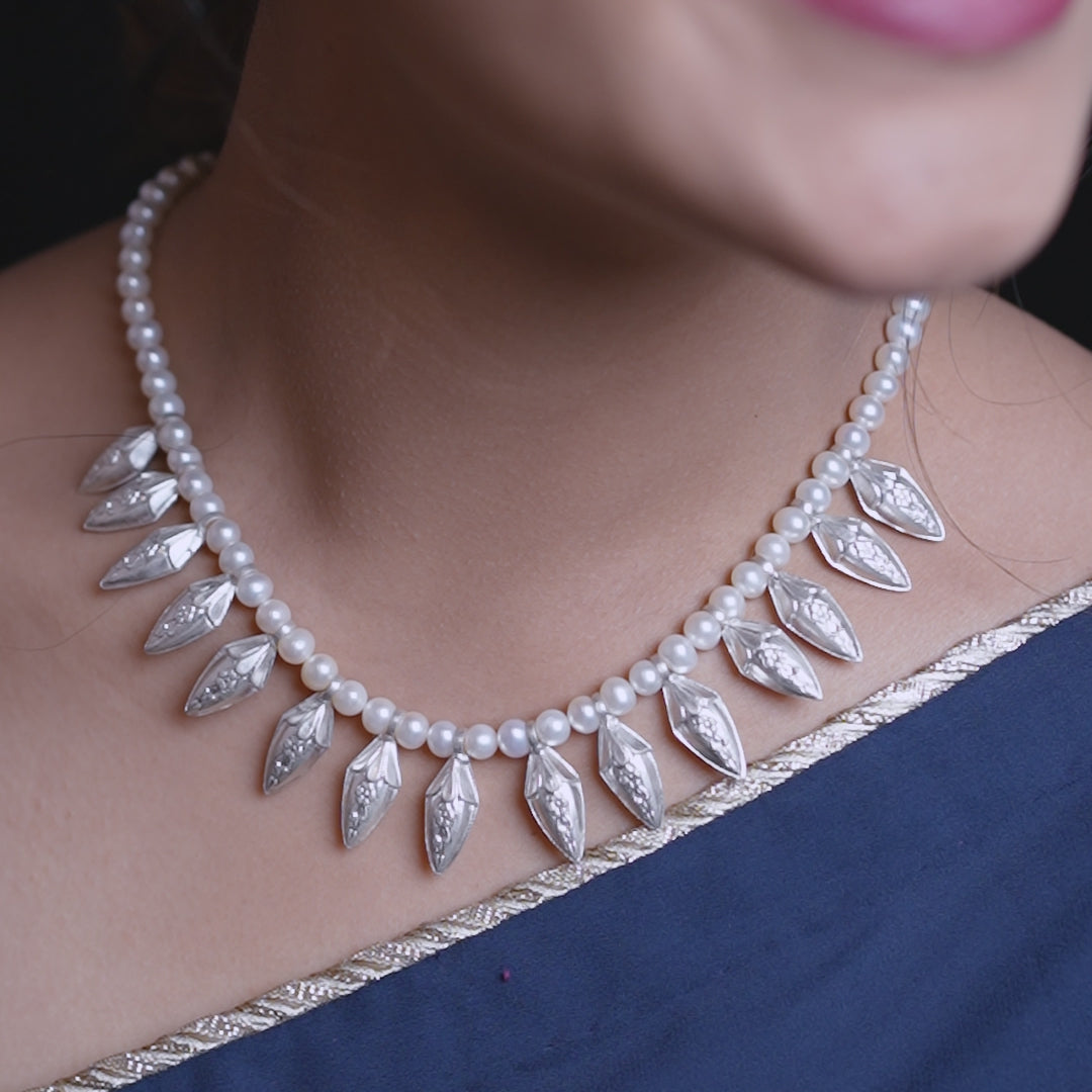CHAMPAKALI, a traditional pahadi-style necklace made in 92.5 pure silver, inspired by champaca buds, adjoined with pearls. A dainty, elegant neck grazer that enhances your personal style. Our moulds are over 200 years old, and each piece is handcrafted with indigenous techniques by our artisans. Our pieces are lightweight, one-size fits all and can be effortlessly styled with festive. occasional and casual wear.