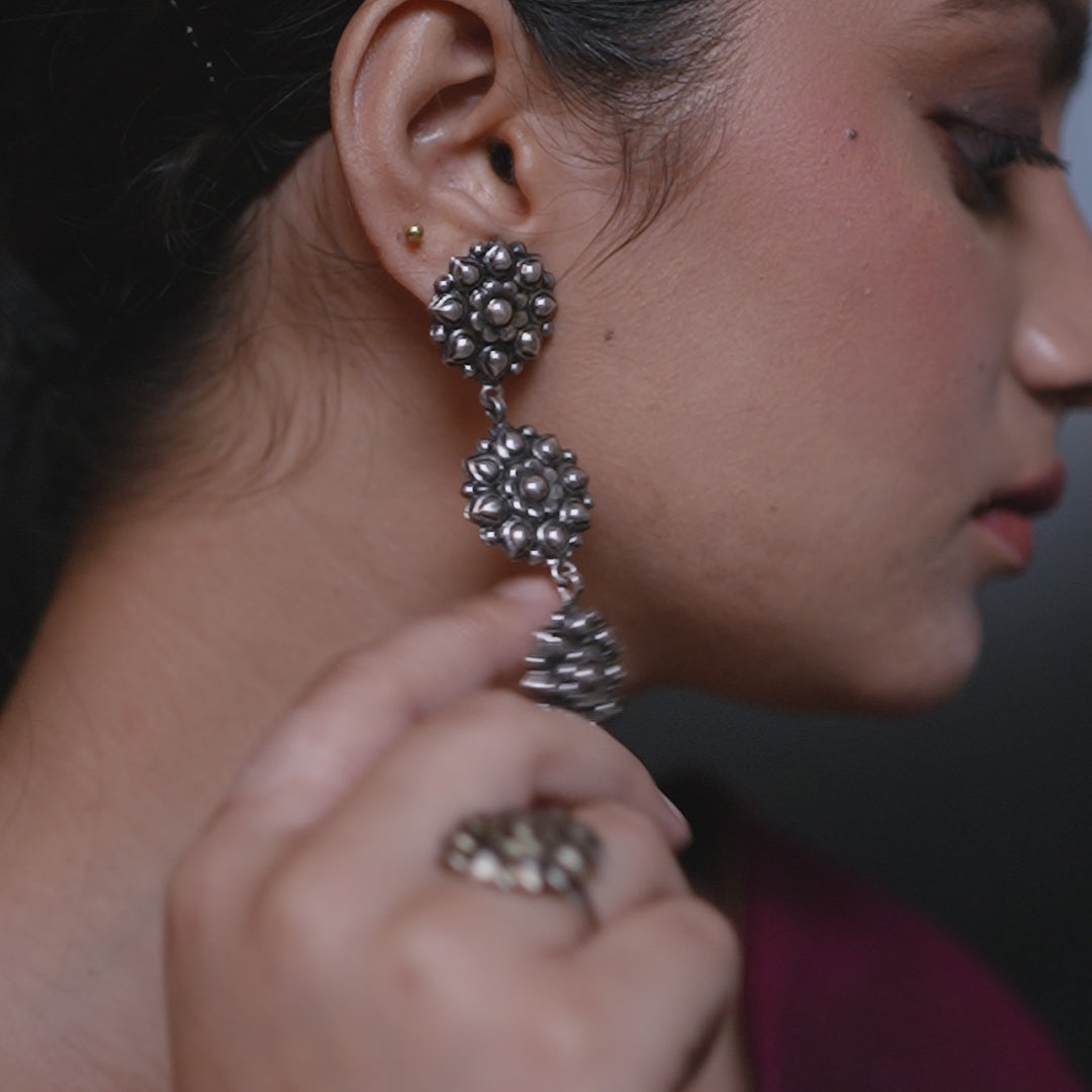 Three tiered chandak flower inspired ear danglers in 92.5 pure silver.The moulds are over 200 years old, and each piece is handcrafted with indigenous techniques, are lightweight and one-size fits all. Our jewels can be effortlessly styled with festive, occasional and street wear redefining new-age staples. This earring pairs with matching guluband and browse through our range of pahuchi to compliment. Available in different finishes, please check before making your purchase. Our products are handcrafted, slight irregularities are natural and only make it unique.