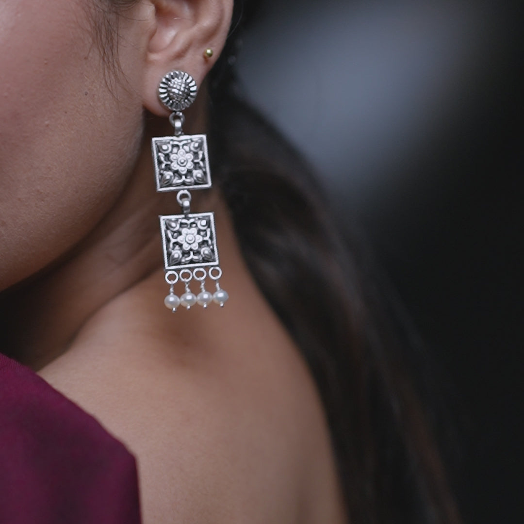 Our patent square floral plated pahadi-style ear danglers in 92.5 pure silver. The moulds are over 200 years old, and each piece is handcrafted with indigenous techniques, are lightweight and one-size fits all. Our jewels can be effortlessly styled with festive, occasional and street wear redefining new-age staples. This earring pairs with matching guluband and browse through our range of pahuchi to compliment.