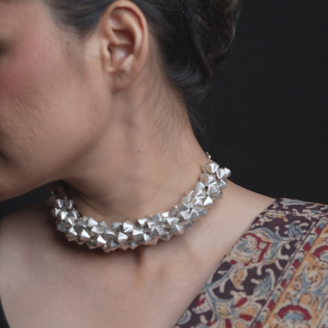 Ejaa house designed, pine cone inspired pahadi-style choker in 92.5 pure silver, tugged onto a thread chain to fasten. The moulds are over 200 years old, and each piece is handcrafted with indigenous techniques, are lightweight and one-size fits all. Our jewels can be effortlessly styled with festive, occasional and street wear redefining new-age staples. This Guluband pairs well with matching earrings and can be layered with our matarmalas to create unique styles.