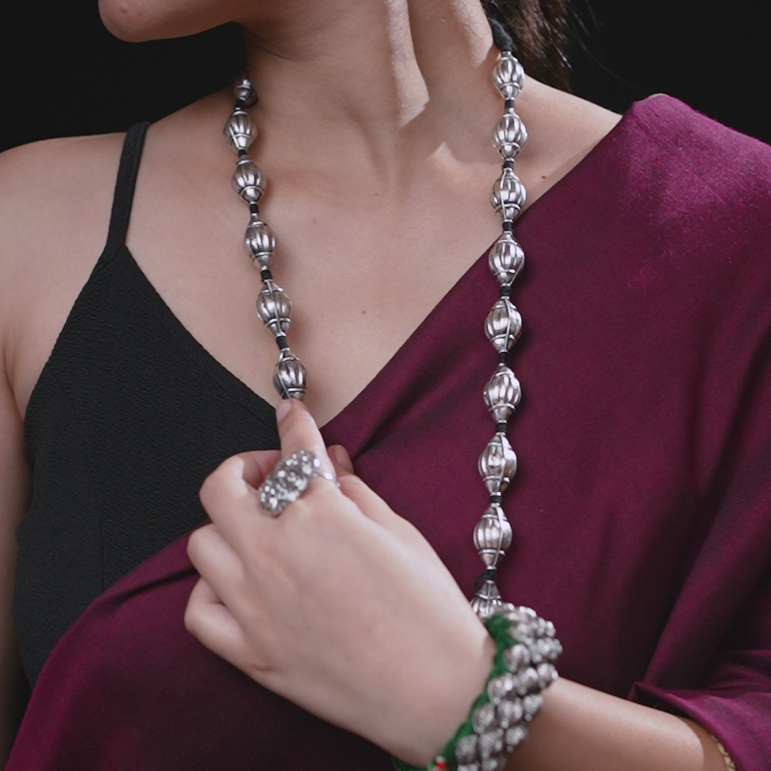 This is a traditional pahadi-style matar(beads) inspired by wheat grain, made in silver strings in 92.5 pure silver with a thread chain to fasten. Our moulds are over 200 years old, and each piece is handcrafted with indigenous techniques by our artisans. Our pieces are lightweight, one-size fits all and can be effortlessly styled with festive, occasional and street wear. Jau matarmala can be layered with our range of guluband or tilhairi to create interesting looks.