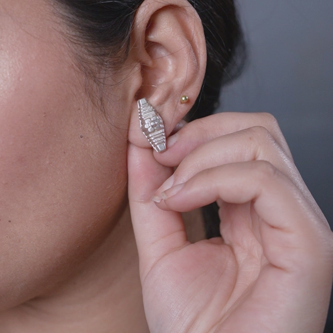 Inspired by the grading lines of the valleys, pahadi-inspired ear studs in 92.5 pure silver. The moulds are over 200 years old, and each piece is handcrafted with indigenous techniques, are lightweight and one-size fits all. Our jewels can be effortlessly styled with festive, occasional and street wear redefining new-age staples. This earring pairs with matching guluband and browse through our range of pahuchi to compliment.