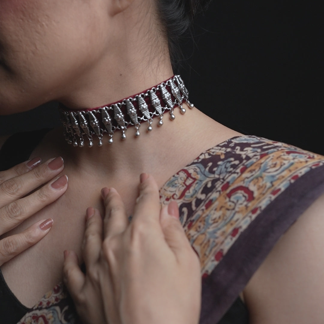 Our patent square floral plated/ KOSI pahadi-style choker in 92.5 pure silver, tugged onto a handwoven thread belt to fasten. The moulds are over 200 years old, and each piece is handcrafted with indigenous techniques, are lightweight and one-size fits all. Our jewels can be effortlessly styled with festive, occasional and street wear redefining new-age staples. This Guluband pairs well with matching earrings and can be layered with our matarmalas to create unique styles.