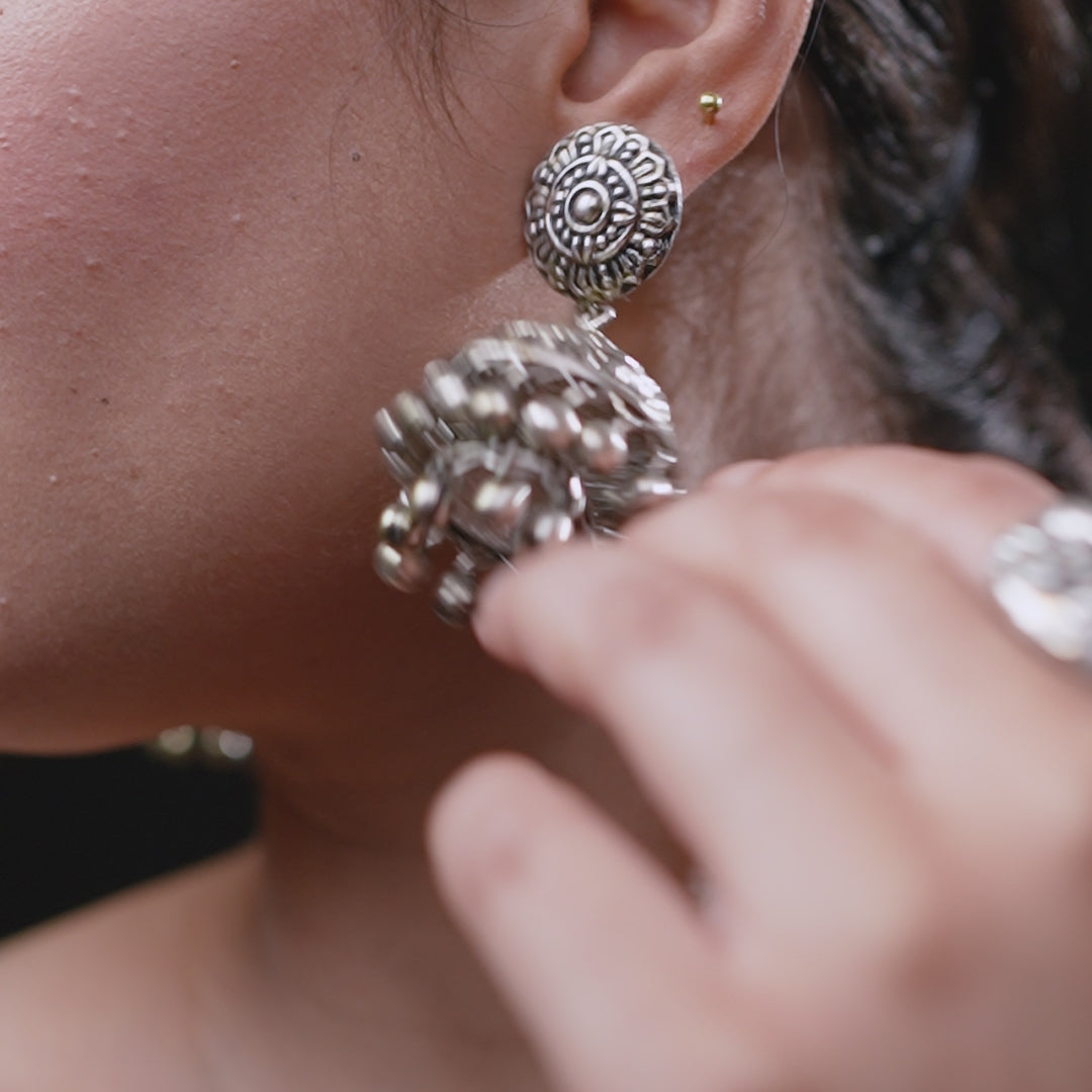 A pahadi-inspired quaint, floral motif jhumki with a dotted border, made in 92.5 pure silver. Reinterpreting jhumkis with iconic pahadi motifs, moulds dated over 200 years old, handcrafted using indigenous techniques. Each of our piece is beautifully and passionately made, are lightweight and effortless to style with festive, occasional and street wear. Available in different finishes, please check before making your purchase. Our products are handcrafted, slight irregularities are natural and only make it unique.