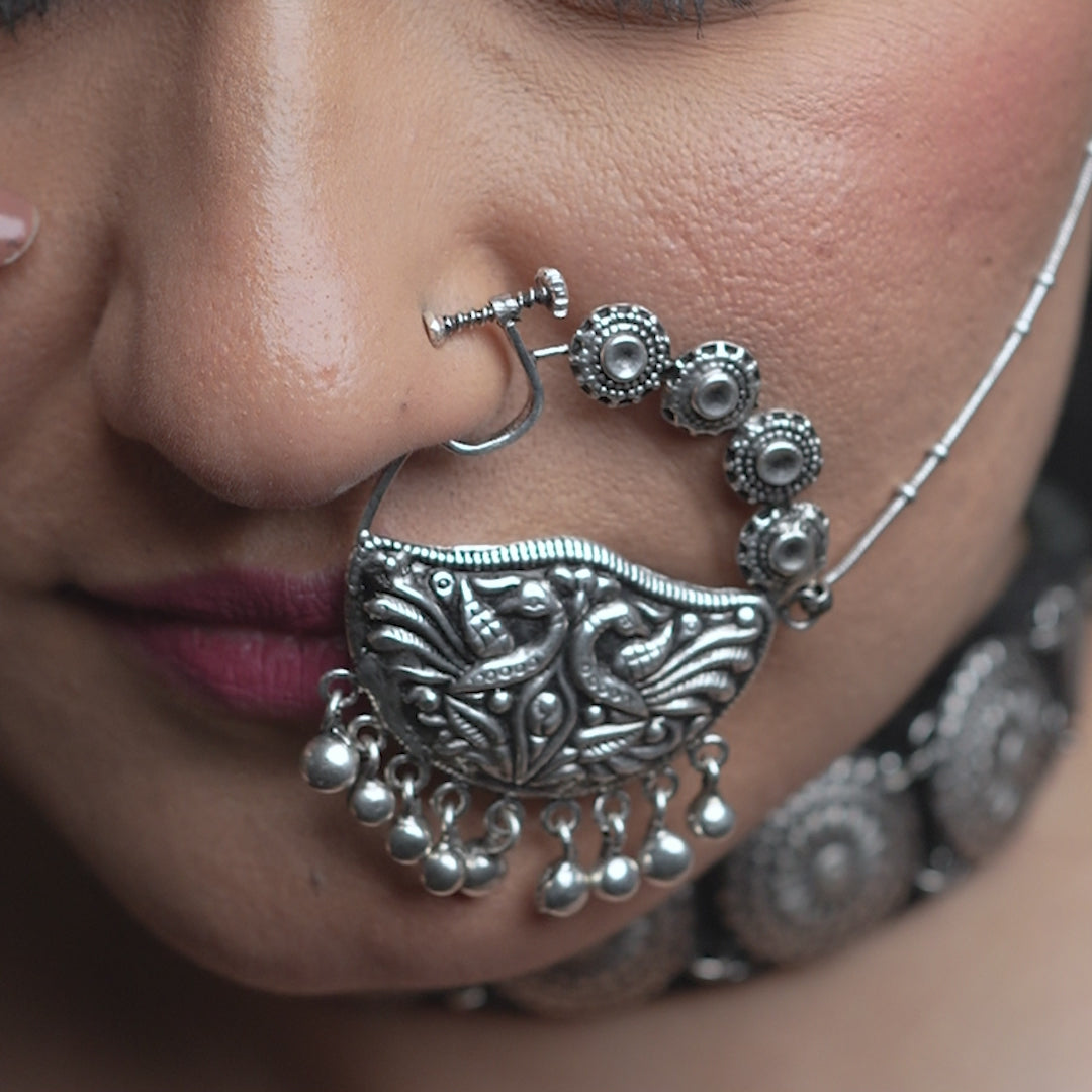 This is a traditional pahadi-style nosering crafted in 92.5 pure silver donning two peacocks in a ring fastened with a earhook with a screw-technique that doesn’t require a piercing.