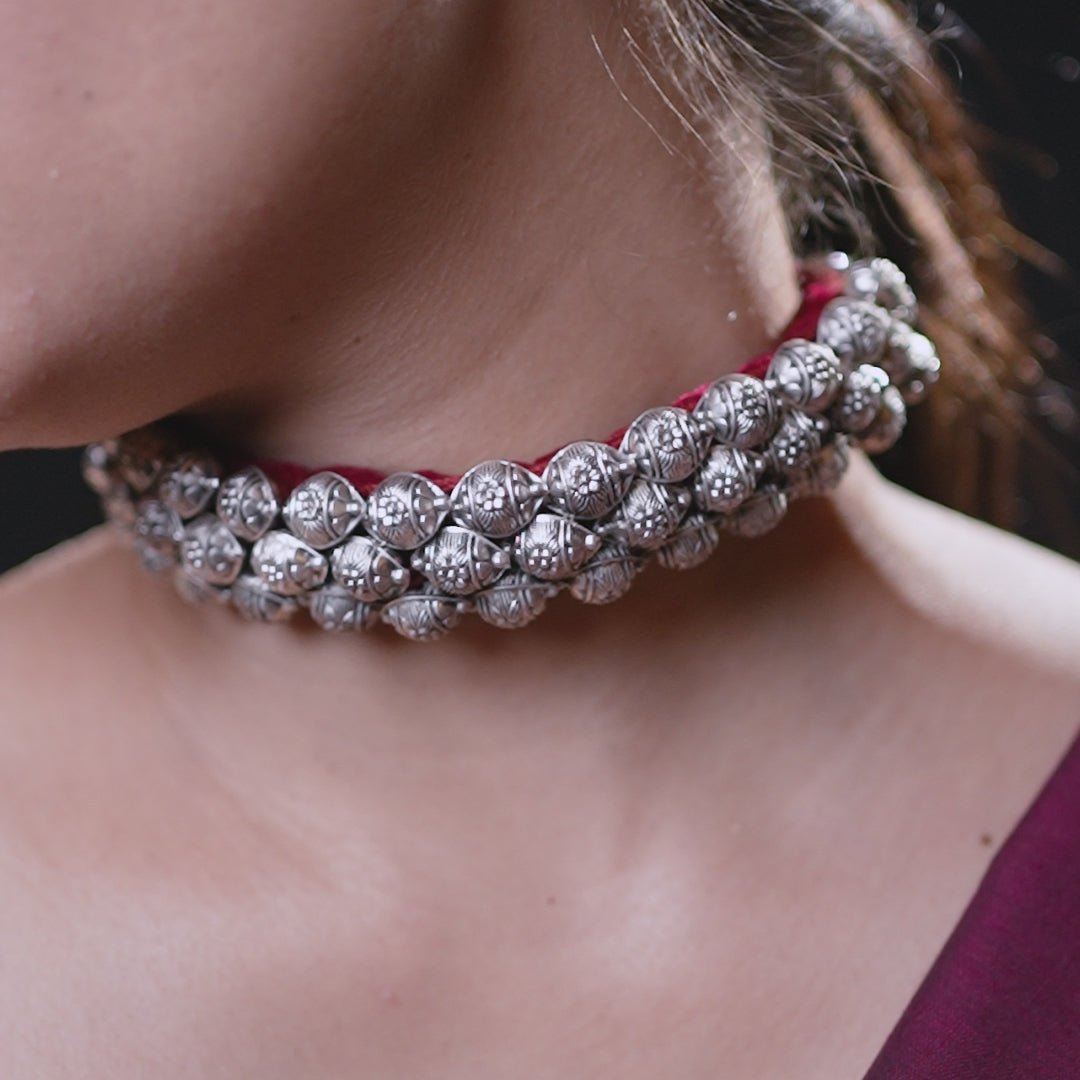 This is a pine cone inspired, pahadi-style choker in 92.5 pure silver, tugged onto a handwoven thread belt to fasten. The moulds are over 200 years old, and each piece is handcrafted with indigenous techniques, are lightweight and one-size fits all. Our jewels can be effortlessly styled with festive, occasional and street wear redefining new-age staples. This Guluband pairs well with matching earrings and can be layered with our matarmalas to create unique styles.
