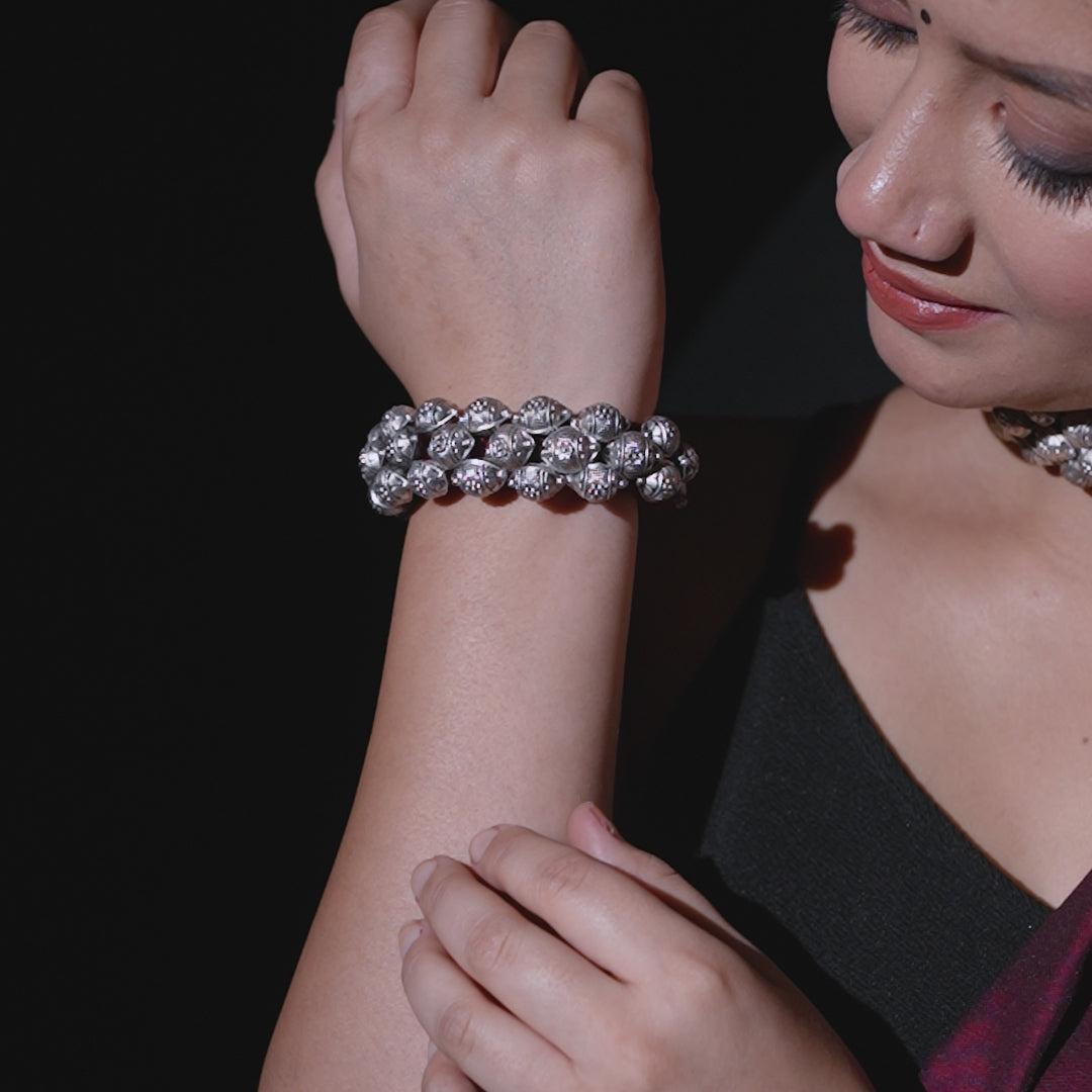 A distinct pahadi-style bracelet made in 92.5 pure silver beads inspired by conch shells, tugged onto a handwoven thread belt to fasten. Our moulds are over 200 years old, and each piece is handcrafted with indigenous techniques by our artisans.