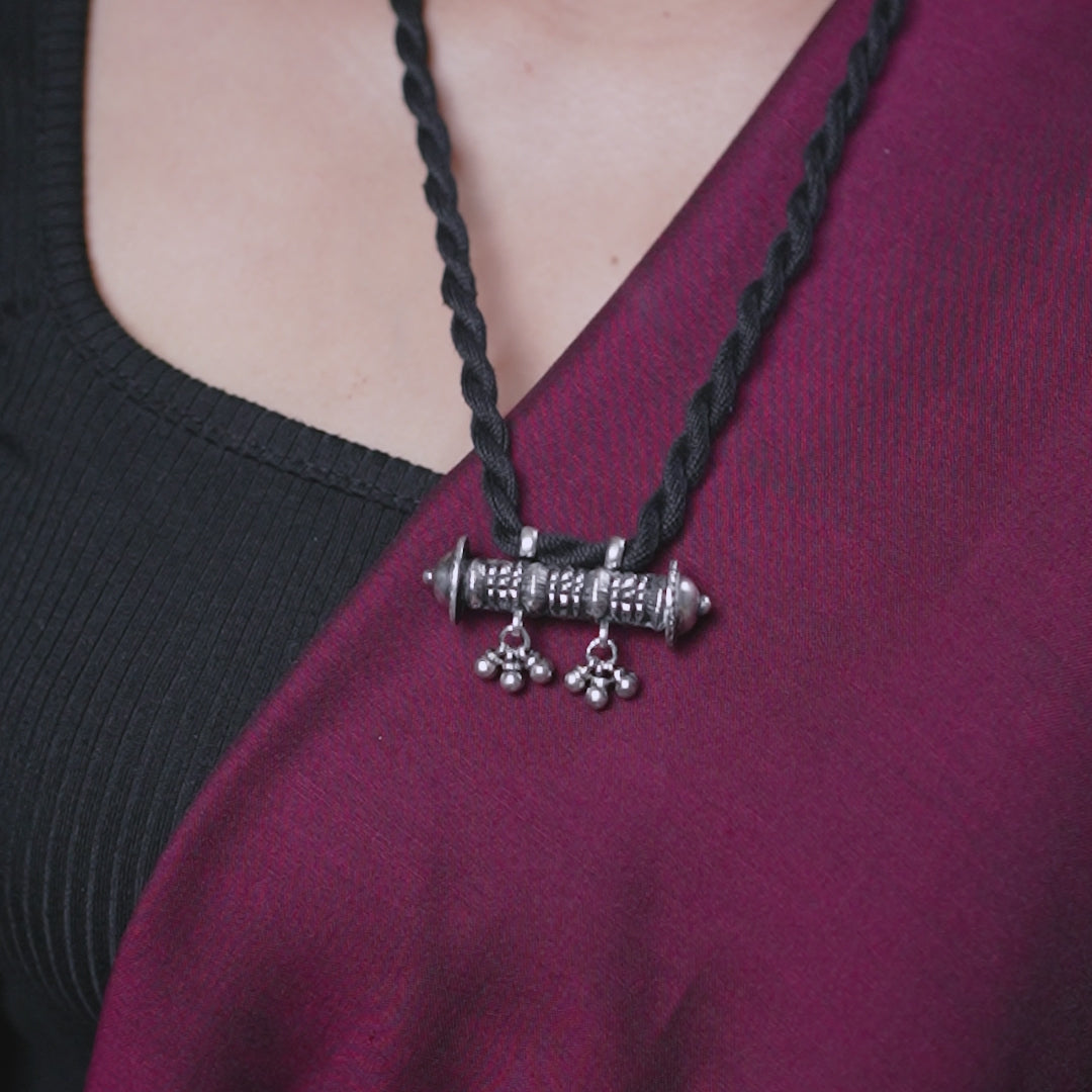 This is a traditional pahadi landscape inspired pure 92.5 silver pendants with handwoven thread chains to fasten. Our moulds are over 200 years old, and each piece is handcrafted with indigenous techniques by our artisans. Our pieces are lightweight, one-size fits all and can be effortlessly styled with festive, occasional and street wear. This tilhari is quintessentially worn by itself or can also be paired with gulubands or matarmalas for a more elevated look.