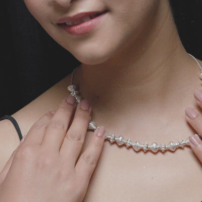 Dhanri Mala- A traditional Pahadi-inspired silver mala featuring textured conical beads with fine line engravings, echoing the artistry of old Himalayan craftsmanship.