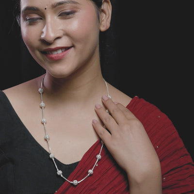 Dhanri Mala- A traditional Pahadi-inspired silver mala featuring textured conical beads with fine line engravings, echoing the artistry of old Himalayan craftsmanship.