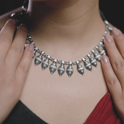 Jaukanthi Haar — A heritage-inspired design featuring conical silver forms reminiscent of barley grains, symbolising prosperity and rooted tradition.