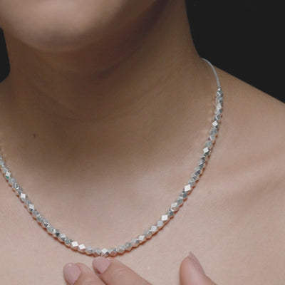 Noorja Mala — A sleek string of faceted silver beads that capture light like mountain dew, radiating understated elegance.
