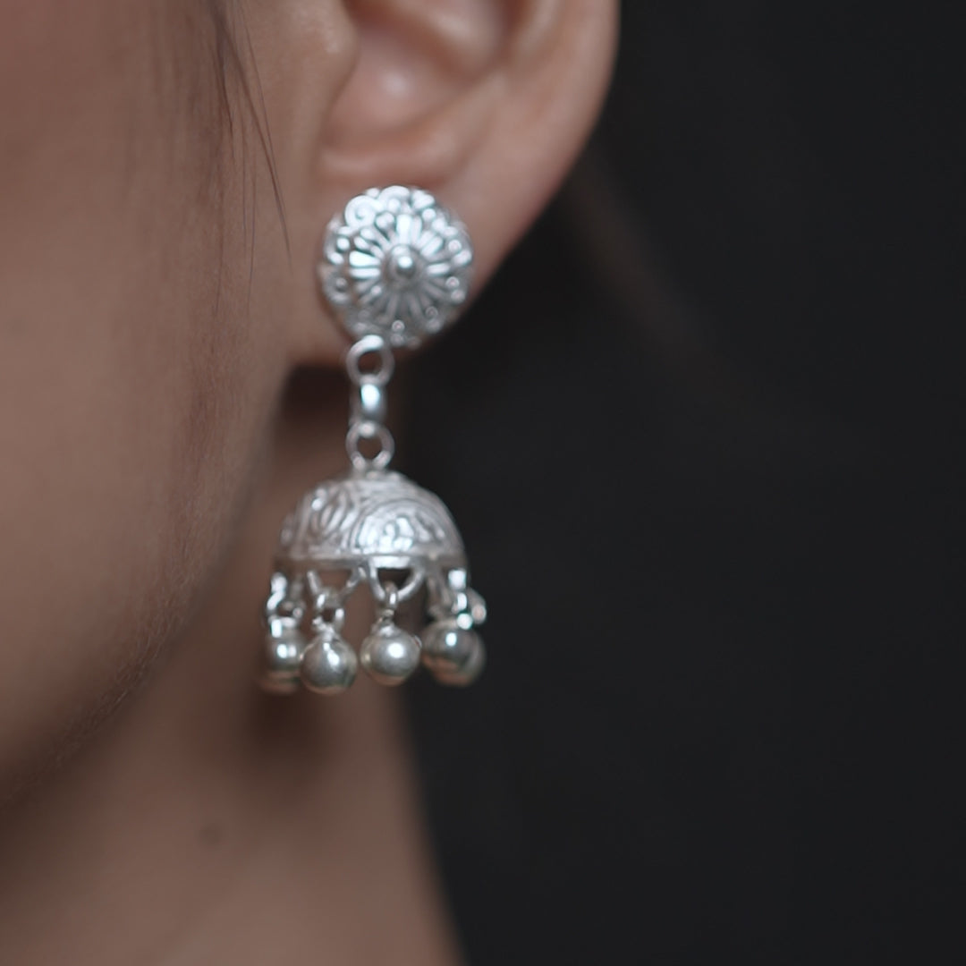 A pahadi-inspired quaint, floral motif jhumki with a dotted border, made in 92.5 pure silver. Reinterpreting jhumkis with iconic pahadi motifs, moulds dated over 200 years old, handcrafted using indigenous techniques. Each of our piece is beautifully and passionately made, are lightweight and effortless to style with festive, occasional and street wear. Available in different finishes, please check before making your purchase. Our products are handcrafted, slight irregularities are natural and only make it unique.