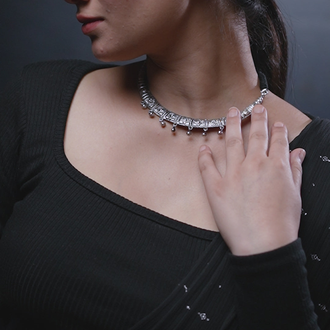 This is a traditional pahadi-style collar choker with ghunghroo, made in 92.5 pure silver with a handwoven thread chain to fasten. An Ejaa Statement design made for bold, powerful looks.
